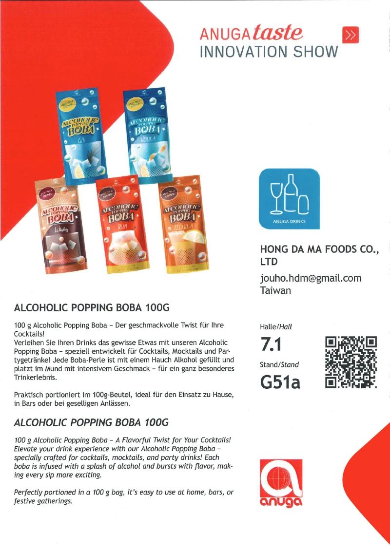 Hung Da Ma Foods proudly introduces its latest innovation, Alcoholic Popping Boba 100g, at ANUGA 2025 in Cologne, Germany. The product has been selected for the ANUGA Innovation Show, highlighting its originality, creativity, and strong market potential.